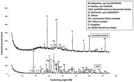 Figure 2 shows that krotite (CaAl2O4), mayenite (Ca12Al14O33) and gehlenite (Ca2Al2SiO7) are the major mineral phases. Silicon carbide (SiC) and graphite (C) are also detected. According to Figure 2, the main mineralogical phases of the leaching residue are metallic silicon (Si), silicon carbide (SiC) and graphite (C). Thus, the residue contains some remaining impurities from the raw material, while the main phases are not visible, indicating complete Ca and Al dissolution.