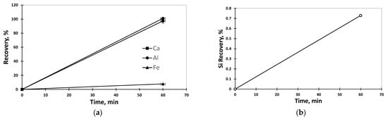 Time evolution of (a) Al recovery Ca and Fe recovery and (b) time evolution of Si recovery after the leaching with 5.87 M HCl, at 80 °C, agitation 300 rpm for 1 h, solid to liquid ratio (S/L) 1/10.