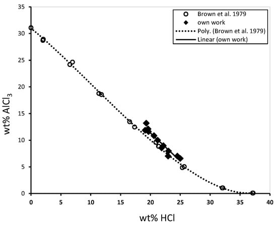 To study the yield of a single step, the solubility of aluminium chloride as a function of HCl concentration must be understood. Figure 4 shows the dependence of this solubility with own data in comparison to the literature.