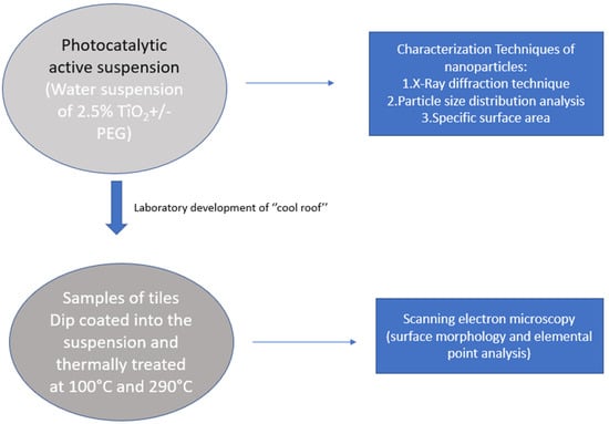 Samples of coated roofing tiles were used for scanning electron microscopy (SEM) imaging by which morphological characterization of the nanoparticles on the surfaces of the tiles was performed. X-ray mapping was also carried out using a JSM-IT500 microscope (JEOL InTouchScope series model) to determine elemental distribution on the tiles’ surfaces. A synopsis of the methodology is presented in Figure 1.