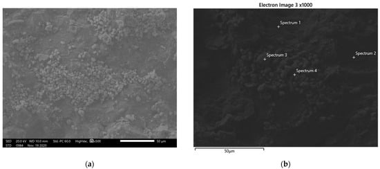 Scanning electron microscopy (SEM) images showing: (a) nanoparticles of titanium dioxide on coated type C roof tiles; (b) different spectrum areas in which elemental analysis was made.