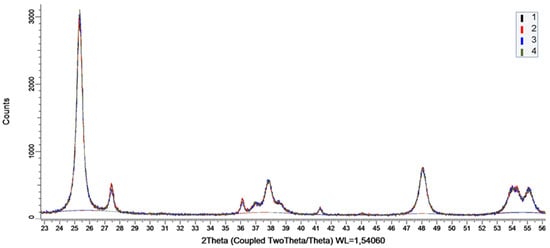 For the characterization of the samples, TiO2 aqueous suspensions with and without PEG were dried in an industrial furnace at 100 °C and 290 °C. A total number of 12 samples was prepared. Characterization techniques were carried out and determination of sample phase compositions was examined by XRD analysis. XRD measurements of dried and thermally treated samples were performed using a Brucker D8 Advance diffractometer operating in the reflection mode with Cu Ka radiation in the 2θ interval of 10–80°. Diffraction patterns of the powders were compared with the reference in the ICDD database.