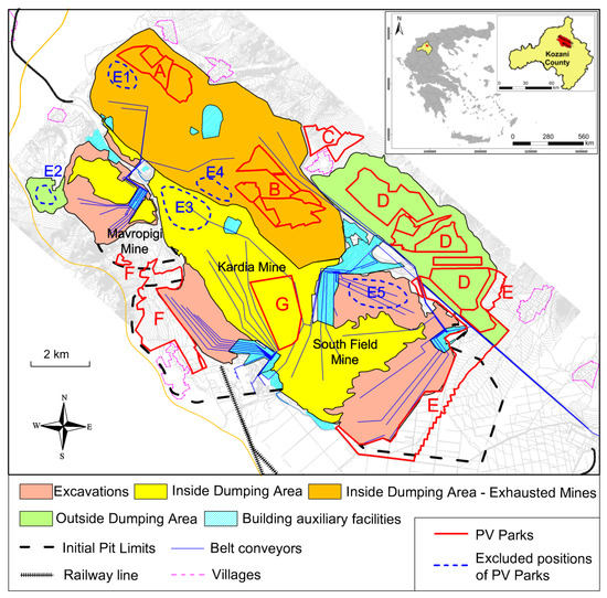 The simultaneous operation of lignite power plants, mines, and related infrastructure, such as belt conveyors, roads, substations, and HV lines, with the development, approval, and construction of PV stations, is an increasingly important area involving both technical and licensing issues. Each of these three functions is governed by a different licensing regime, which must be fulfilled and observed simultaneously, with every action requiring to be considered to avoid any adverse effects resulting from these functions [7,8]. The above framework and the particular characteristics of the areas led to an original approach for developing PV Stations in the areas of lignite mines in Western Macedonia.