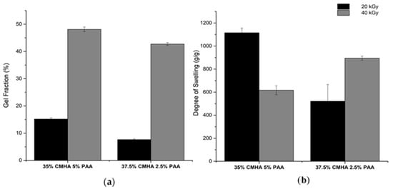 Hydrogels for biomedical uses undergo initial characterization through the determination of their gel content and swelling properties. These two properties can be used as a means to assess the stability of hydrogels in aqueous solutions []. The gel properties of CMHA-PAA are shown in Figure 1. The gel fractions substantially increased as the absorbed dose became higher, from 20 to 40 kGy (Figure 1a). Hydrogel blends of 35% CMHA, 5% PAA had higher gel fractions compared to the 37.5% CMHA, 2.5% PAA blend for both doses. These values show that higher irradiation doses and higher concentrations of PAA result in more crosslinking, hence the higher gel fractions.