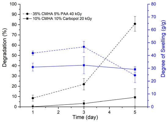 By using the simulated ionic and pH conditions of biological fluids, such as PBS (pH = 7.4), at 37 °C, the stability of the samples could be initially assessed []. Figure 5 shows that a formulation with the equal weight ratio of 10% CMHA, 10% Carbopol irradiated in 20 kGy has a stable crosslinking network exhibiting a stable swelling property without a significant increase in the degradation percentage of PBS. Biomedical hydrogels with stable gel properties in biological fluids can potentially be used for applications that need longer exposure when implanted in the body.
