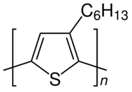 Poly(3-hexylthiophene) (P3HT) is a p-type semiconductor and is intrinsically a donor material. P3HT is a regioregular polymer, which means that each repeating unit is derived from the same isomer of the monomer, and is one of the most attractive polymers available because of its high electrical conductivity and solubility in various solvents. Moreover, P3HT has a high absorption coefficient (in the order of 105 cm−1) and can absorb more than 95% of the solar spectrum over a wavelength range of 450–600 nm when deposited in a 240 nm thick film. This makes it very attractive for organic optoelectronic devices []. Moreover, P3HT possesses several other advantages such as solution processability and easy and low-cost fabrication. It also possesses one of the highest electrical mobilities of the known conjugated polymers: 0.2 cm2/(V·s). However, this mobility is considered low when compared to those of inorganic semiconductors (Figure 1) [,].