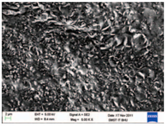 Several methods for the preparation of P3HT/G nanocomposites have been reported, including solution mixing and in situ polymerization [,]. In situ polymerization consists of mixing nanofillers with a liquid monomer or a precursor of a low molecular weight. When a homogenous mixture is attained, polymerization is initiated by the addition of an appropriate initiator, which is exposed to a source of heat, radiation, etc. []. Polymerization is carried out by adjusting the temperature and time. It is a very effective method that allows carbon-based nanofillers to be dispersed uniformly in the matrix, thereby providing a strong interaction between them []. A representative SEM image of the P3HT/G nanocomposite is shown in Figure 2. However, certain conditions must be fulfilled, including the use of low-viscosity monomers, a short period of polymerization, and no formation of side products during the process.