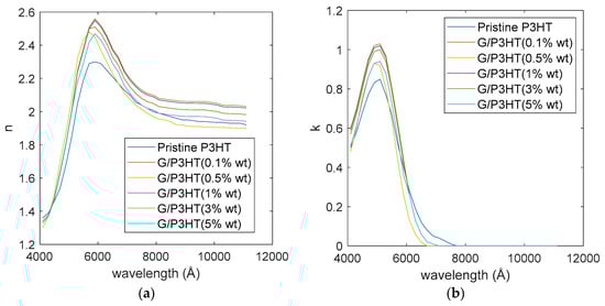 In the following section, the evolution of the complex refractive index of P3HT/G with G content is discussed. The data of Saini et al. [] for n and k for six nanocomposites with different loads of graphene are registered.