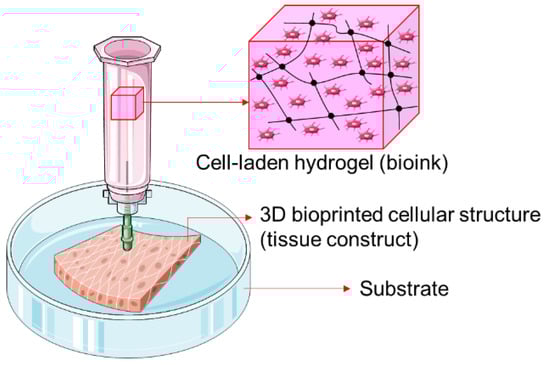 There are a variety of hydrogels commonly used in three-dimensional (3D) bioprinting, which is a process involving the deposition of cell-laden hydrogels (or bioinks) on a substrate (Figure 1). Hydrogels are synthetic matrices made up of a network of hydrophilic polymers that absorb water and/or biological fluids. They can be created from a large number of water-soluble materials, including synthetic polymers (e.g., polyethylene glycol, polylactic acid, etc.), proteins (e.g., collagen, gelatin, etc.), and polysaccharides (e.g., alginate, hyaluronic acid, etc.) [,,,].