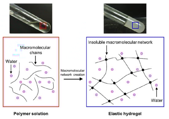 The 3D structure of these hydrogels is due to crosslinking, which forms an insoluble macromolecular network in the environmental fluid (Figure 2). The resemblance to different biological tissues, due to the elasticity and the presence of a large amount of water, allows the use of hydrogels in the regeneration of several types of damaged tissues (e.g., fibrin hydrogel is seeded with neural cells to regenerate brain tissue, keratinocytes are seeded in collagen hydrogel to regenerate skin tissue, etc.) [,].