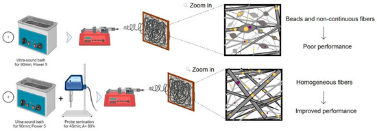 The use of nanoparticles in electrospinning has gained great attention in recent years, due to nanoparticle characteristics, namely their high surface area to volume ratio [1]. Magnesium oxide nanoparticles (MgO NPs) and copper oxide nanoparticles (CuO NPs) are known for their antimicrobial properties, thermal and electric ability, and are extensively used in several fields, including biomedical, environmental remediation, energy storage, catalysis, among others [2,3]. Since electrospinning uses an electrical field to stretch the polymeric solution into the collector, the nanoparticle’s conductivity and their electrical charges might lead to particle agglomeration [4]. In fact, the agglomeration of the nanoparticles induces beads and non-continuous fibers formation, compromising the electrospun mesh morphology, and their performance. To overcome the aforementioned drawbacks, magnetic stirring is commonly used to disperse the nanoparticles into the solution, although this does not prevent the particle’s agglomeration. Another methodology used includes the nanoparticle’s dispersion by ultra-sounds, although only a few works are describing its use and the dispersion depends on several parameters, such as amplitude (ꓮ; µm), frequency (ƒ; Hz), and power (P; W).