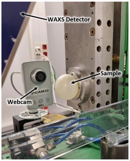 Moreover, we evaluated how the process changed with different deformation symmetry. To achieve this, a new experimental stage system (Figure 1) was designed and tested to collect in situ X-ray scattering data during the biaxial deformation of natural rubber films. The equipment was mounted and aligned on the beamline of the ALBA Synchrotron Light Facility in Barcelona. Natural rubber films, in the form of discs, were mounted in the stage and deformed as a bubble using air pressure. The stage was designed so that the incident X-ray beam passed through the pole of the bubble, where the strain was purely biaxial. Small and wide-Angle X-ray scattering (SAXS/WAXS) data were recorded at different air pressures to continuously deform the rubber film. Both WAXS and SAXS showed different scattering features for the uniaxial and biaxial cases.