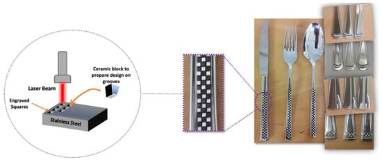 As shown in Figure 1, AISI-304 stainless steel, which is the general flatware material selected for laser engraving, was evaluated with three most vital input parameters (power, scanning speed and loops or number of passes) followed by the analysis of geometry, roughness, and volume removed/material removal (MR) as output variables. This study will provide insight into the know-how situation involving the processing of cutleries and introduction of different ceramic materials to the surface to define desired patterns. We produced different design patterns by laser and ingrained ceramic blocks on the silverware. This approach is much more flexible and adoptable for pattern changes. Besides that, there is no need to prepare a mould for each design. Belo Inox, Portugal supplied the silverware as per the collaborative project agreement.