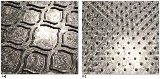 Photographs of steel embossing plates: (a) deco embossing and (b) micro embossing.