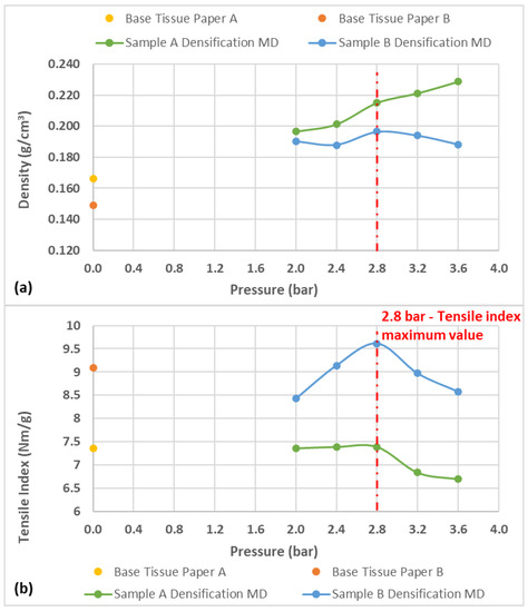 Results obtained for: (a) density and (b) tensile index with the pressure increase in the base tissue paper densification of the samples A and B.