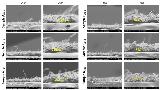 SEM images of cross-sections in samples A and B, at two magnifications (×100 and ×300), at pressures 2.4, 2.8, and 3.2 bar. In the images with x300 magnification, the distances from the base to the crepe of the crepe wave are shown.