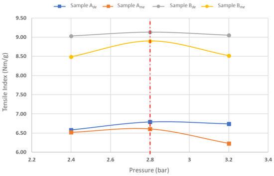 Results obtained for the tensile index, with the pressure increase in samples A and B with deco and micro embossing.