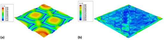 This behavior was also studied using the Explicit Finite Element Method (FEM), considering densification as an associative isotropic hardening associate with an anisotropic elasto-plastic model. This model was implemented as a VUMAT (Vectored User MATerial), which is linked to Commercial Finite Element Software AbaqusTM version 6.14 (Waltham, MA, USA) to simulate the embossing process. The displacement fields can be observed in Figure 6 for both embossing patterns.