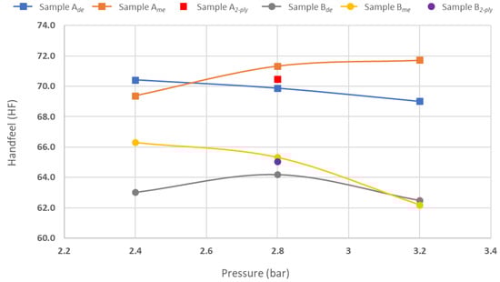 Results obtained for handfeel (HF), with the pressure increase in samples A and B with deco and micro embossing.