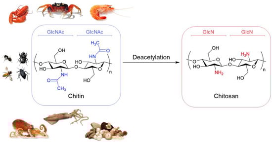 Hydrogels are synthetic matrices made up of a network of hydrophilic synthetic polymers or natural polymers (i.e., biopolymers) that absorb water and/or biological fluids. The current strategy to design and produce hydrogels involves a range of various biopolymers, among them chitosan. Chitosan’s non-toxic, biocompatible, and biodegradable characteristics allow its use as a hydrogel in many successful applications within the biomedical and environmental fields [3,4,5]. Chitosan is a linear amino-polysaccharide of β(1→4)-linked D-glucosamine and N-acetyl-D-glucosamine residues. Also called poly-β-(1-4)-2-amino-2-deoxy-β-D-glucose, it is a natural heteropolymer obtained by alkaline deacetylation of the amino acetyl groups of chitin, which is the main component of fungi and the exoskeleton of insects, crabs, shrimp, and krill (Figure 1) [6].
