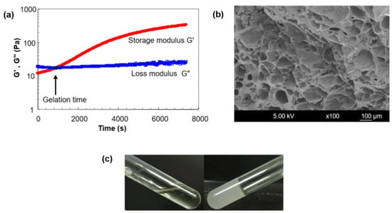 (a) Rheological properties of chitosan hydrogel displayed as storage and loss moduli as a function of time at 37 °C. (b) Morphological observation of chitosan hydrogel obtained by scanning electron microscope. (c) Photographs of chitosan hydrogel before and after gelation at 23 and 37 °C, respectively (Figure a,b are reprinted from Fatimi et al., 2012 [4], with permission from Elsevier Ltd., Amsterdam, The Netherlands, Published under license. Copyright 2012 Acta Materialia Inc., Bethesda, MD, USA).