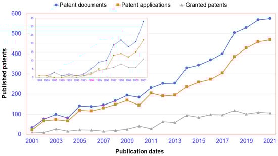 The supported field codes used in this study were based on the Patentscope search service of the World Intellectual Property Organization (WIPO) [13], the Espacenet patent search of the European Patent Office (EPO) [14], the PatFT/AppFT Databases of the United States Patent and Trademark Office (USPTO) [15], and the Lens patent data set of the Cambia Institute [16]. During the search, different keywords and related terms were used, and patents were searched according to title, abstract, and claims. The search was then filtered to include only documents with a publication date until 31 December 2021.