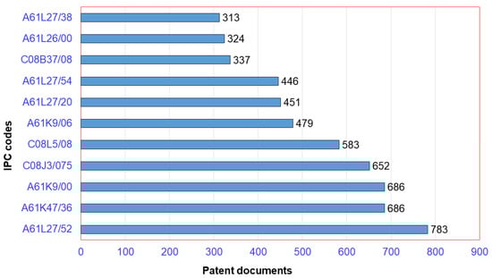 IPC codes (top 10) of resultant patent documents for chitosan-based hydrogels.