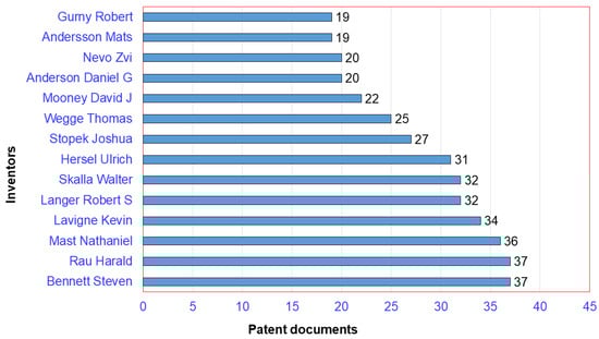 The top 10 inventors of patents concerning chitosan-based hydrogels between 1983 and 2021 are presented in Figure 5. The first place podium is shared between the two inventors, Bennett Steven and Rau Harald, who have recorded 37 patent documents each. In second place, the inventor Mast Nathaniel has recorded 36 patent documents. Thirdly, the inventor, Lavigne Kevin, has recorded 34 patent documents. The patent documents of the three inventors, Bennett Steven, Mast Nathaniel, and Lavigne Kevin, are primarily concerned with the company Covidien LP (Mansfield, MA, USA). However, the patent documents of the inventor Rau Harald are primarily concerned with the company Ascendis Pharma AS (Hellerup, Denmark).