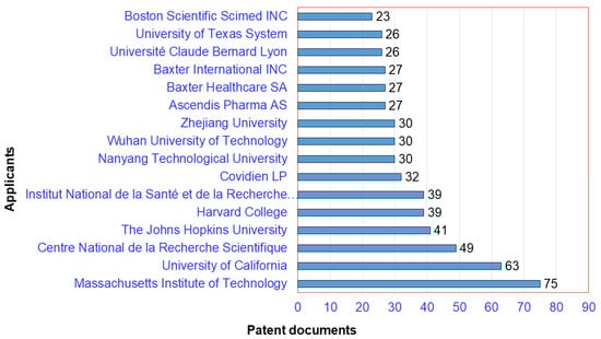 The top 10 applicants for patents concerning chitosan-based hydrogels between 1983 and 2021 are presented in Figure 6. As presented, all the top 10 applicants are organizations, either universities, academic institutions, or companies. As a legal entity, the Massachusetts Institute of Technology (Cambridge, MA, USA) is ranked as the first applicant that has recorded 75 patent documents. In second place, the University of California (Los Angeles, CA, USA), as a legal entity, has recorded 63 patent documents. As for the third place podium, the Centre National de la Recherche Scientifique (Paris, France), as a legal entity, has recorded 49 patent applications.