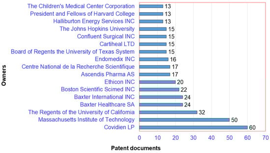The top 10 owners of patents concerning chitosan-based hydrogels between 1983 and 2021 are presented in Figure 7. As presented, all the top 10 owners are organizations, either universities, academic institutions, government bodies, or companies. As a legal entity, the company Covidien LP (Mansfield, MA, USA) is ranked as the first owner who has recorded 60 patent documents. In the second and third places, the owners, Massachusetts Institute of Technology (Cambridge, MA, USA), as a legal entity, and the Regents of the University of California (Los Angeles, CA, USA), as a government body, have recorded 50 and 32 patent documents, respectively.