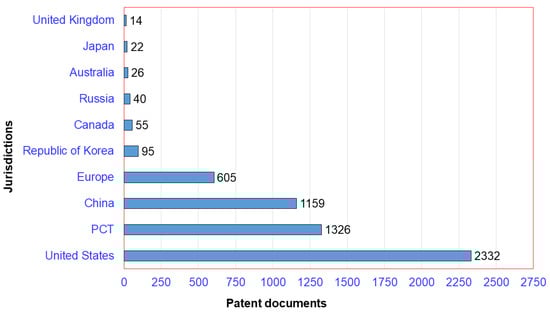 The top 10 jurisdictions of patents concerning chitosan-based hydrogels between 1983 and 2021 are presented in Figure 8. The United States through the USPTO encompasses 2332 patent documents, with a higher patent contribution per total of 40.67%. On the other hand, the global system for filing patent applications, known as the Patent Cooperation Treaty (PCT) and administered by WIPO, encompasses 1326 patent documents with a patent contribution per document total of 23.12%. Finally, China, through the CNIPA, encompasses 1159 patent documents with a patent contribution per total of 20.21%, as well as the EPO, through which patent applications are filed regionally (Europe), with 605 patent documents with a patent contribution per total of 10.55%.