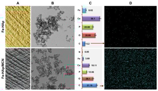 (A) Colorimetric morphology of Fe doped HAp nanorods and Fe-HAp/MCN nanorods powder. (B) TEM-based microscopic morphology of Fe doped HAp nanorods and Fe-HAp/MCN nanorods. Scale bar, 200 nm. (C) The EDS-based atomic percentage of various elements present in Fe doped HAp nanorods and Fe-HAp/MCN nanorods. (D) EDS mapping of elements present in Fe-HAp nanorods and Fe-HAp/MCN nanorods.