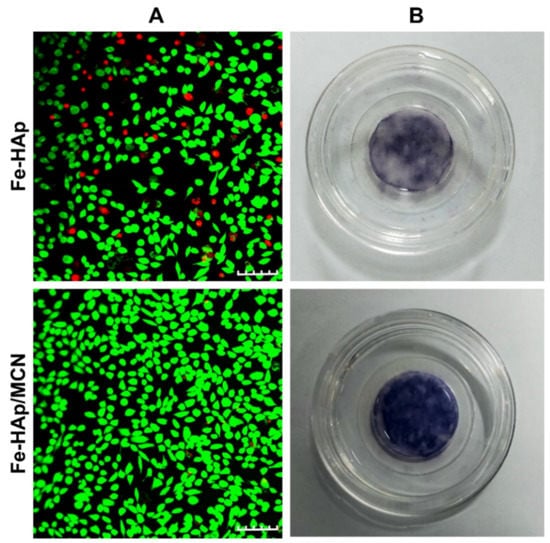 MCN coating is a simple approach that did not require any special equipment, does not involve harmful chemical reagents, and generates repeatable nanocoating on the Fe-HAp surface [18]. Various investigations have demonstrated the pH-stimulated role of MCN and depicted that catechol-iron mono-network generated at pH less than 2, bis-network generated at a pH between 2 and 6, and tris-network can be generated at pH around 6–7. Since Fe was doped into the lattice of HAp nanorods, only a few functional sites were available on the nanorod’s surface for interface complexation with catechol moieties. Thus, a 1:1 catechol: Fe3+ or 2:1 catechol: Fe3+ network could be generated onto the nanomaterial’s surface. [19,20]. Since it is challenging to control physical coating at the nano level, the unique MCN coating strategy can be stabilized at the nanoscale range (less than 20 nm). The representative live/dead data showed that live-cells % was higher in modified nanorods treated cells than Fe-HAp treated cells. It supported the notion that the GeLMA-C nanoscale coating onto HAp nanorods significantly promotes their biological role (Figure 2A). The higher ALP quantity (used as an early-stage osteogenic marker) was noted on organic/inorganic nanorods treated MC3T3-E1 cells than on inorganic nanorods treated MC3T3-E1 cells. It demonstrates osteoblast maturation and higher biosynthetic properties of organic/inorganic nanorods (Figure 2B). Overall, these results demonstrated the simplicity of the iron-catechol complexation and indicated that GeLMA-C improved cytocompatibility, build functional interfaces, and could broaden the applications of organic/inorganic nanorods in bone tissue reconstruction.