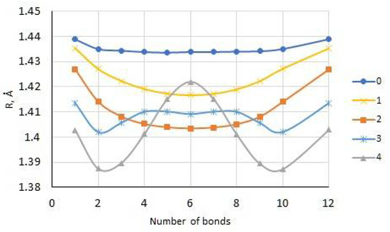 However, already at a low degree of doping, i.e., for the E121+ cation, the lengths of these bonds decrease monotonically from the ends of the chain to its center, reaching a minimum value of 1.417 Å at bond 6 (central), which is typical for the quinoid phase of the systems under study. For the E122+ bication, a similar dependence of the bond lengths between monomeric units is also observed. However, these bond lengths are still significantly smaller compared to similar bond lengths in the E121+ cation, which determines the increase in the contribution of the quinoid phase. For higher oxidation states (+3 and +4), on the corresponding curves of the dependence of the charge on the bond number between the intermonomer units, two minima appear in the bond regions 2 and 3, as well as 9 and 10, which indicates a further increase in the contribution of the quinoid phase and the formation at the ends of the oligomer chain of two separated polarons. Similar dependences were obtained for charged pyrrole oligomers [4].