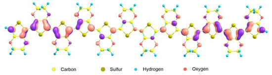 With a further increase in the degree of doping, two polaron hole levels appear in the E122+ bication, spaced from the top of the valence band and the bottom of the conduction band by 0.50 eV. There are three such levels in the E123+ cation, two of which lie at a distance of 0.8 eV from the top of the valence band, and one is 0.90 eV away from the bottom of the conduction band. For the E124+ cation, there are already four such hole levels that arise during the fourfold ionization of the E12 oligomer, which in pairs give rise to the formation of a polaron band in the energy gap between the HOMO and LUMO levels. The structure of the molecular orbital corresponding to the lowest level, which lies at a distance of 0.85 eV from the HOMO level (Figure 4), clearly demonstrates the formation of two polarons at the ends of the E12 oligomer. With an appropriate interpretation, confirmation of the fact of the formation of two polarons can be obtained from the corresponding experimental data [5,6].