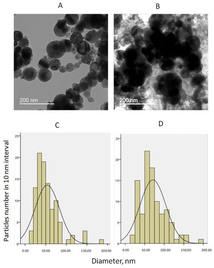 TEM images of NiNP1 (A) and NiNP2 (B). Their size distribution ((C,D), respectively (data obtained by A.G. Masyutin).