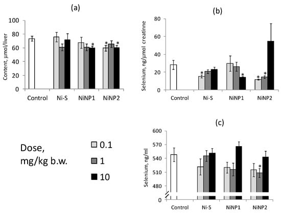 The content of thiol compounds (reduced glutathione) in rat’s liver, µmol/organ (a); specific urinary excretion of selenium, ng/µmol creatinine (b); selenium content in blood serum, ng/mL (c). On the y-axis: values (M ± s.e.m) in the appropriate units. *: difference with the control group is significant, p < 0.05, Mann-Whitney U-test. Number of animals in groups: 6 (a): 8 (b,c).