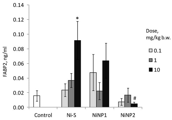 The increase of fatty acids binding protein FABP2 (Figure 3) levels in Ni-salt-exposed animals suggests the presence of intestinal mucosal barrier violations in these animals. Corresponding effects were less pronounced in NiNP1-exposed rats and were eventually absent in NiNP2-exposed rats.