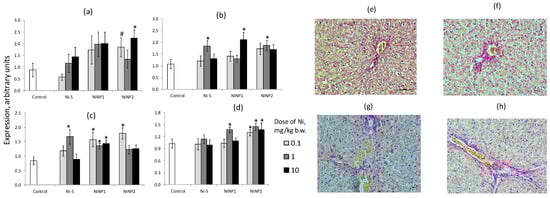 Relative expression of the fibrosis genes Timp3 (a); MMp2 (b), MMp9 (c) and apoptosis factor Tp53 (d) in rat’s liver. On the y-axis—expression (M ± s.e.m.) in relative units. *: difference with the control group is significant; #: difference with nickel salt group is significant, p < 0.05, Mann-Whitney U-test. The number of animals: 6 in each group. Morphology of rat’s liver: liver of a rat from control group (e); liver of a rat with Ni salt, 10 mg/kg b.w (f); liver of a rat with Ni-NP1, 10 mg/kg b.w. (g); liver of a rat with Ni-NP2, 10 mg/kg b.w (h); staining with Fuxin-picric acid (van Gieson). Magnification ×200.