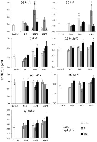The levels of cytokines in the blood serum of rats: (a) IL-1β; (b) IL-2; (c) IL-6; (d) IL-12p70; (e) IL-17A; (f) INF-γ; (g) TNF-α. On the y axis: concentration, pg/mL (M ± m. *: difference with the control group is significant; #: difference with Ni salt group is significant, p < 0.05, Student’s t-test and/or Mann’s U-test. Number of animals: 8 in each group.