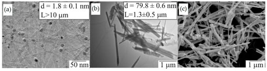 Scanning electron microscope (SEM) imaging was performed with a high-resolution SEM Zeiss Ultra, Germany, with a secondary electron detector, an acceleration voltage of 5.0 kV, and a working distance of 6.0 mm. Transmission electron microscopy (TEM) imaging was performed using a JEOL JEM-2100, Tokyo, Japan, electron microscope. Figure 1 shows representative TEM and SEM images of the WS2NT and CNT films. The NT dimensions are detailed in Table 1. TEM and SEM images allow us to estimate the average diameter and length of NT, which are detailed in Table 1.