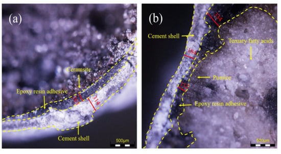 Optical microscope images of encapsulation interfaces of (a) ceramsite-based aggregates and (b) pumice-based aggregates. Adapted from [24].