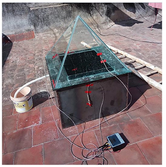 Poyyamozhi and Karthikeyan [28] studied heat transfer performance of solar pond with PCM nanocomposites. The structure of the solar pond consisted of rectangular printed mild steel structure at the bottom with two holes for water passage. The upper part was covered with four triangular glass sheets forming a pyramid as shown in Figure 6. The heat transfer performance of the solar pond was observed for 30 min by incorporating PCM, PCM-AgTiO2, and PCM-CNT nanocomposites. The order of heat transfer in the solar pond was increasing in order as PCM < PCM-AgTiO2 < PCM-CNT. The corresponding maximum heat transfer temperatures were 49 °C, 53 °C, and 61 °C, respectively. The high thermal conductivity of CNT was the reason for better heat transfer performance of PCM-CNT nanocomposite. Tangsiriratana et al. [29] used MPCM coating to improve the performance of solar photovoltaic (PV) panels. The solar PV panels operate at high temperatures of around 60 °C. Their efficiency in the conversion of heat to electricity reduces with an increase in temperature. Thus, temperature reduction is important for improving the energy efficiency of PV panels; this can be done with PCM. The research group used abundantly available natural sugarcane wax as PCM, which has a melting temperature in the range of 77.6–80 °C. The thermal conductivity of wax improved by blending with Al2O3 nanoparticles. The blended wax was further microencapsulated in the gum-arabic shell by complex coacervation. The prepared MPCMs were coated on the backside of the PV panel with thicknesses 4 mm and 7 mm. The PV panel coated with higher thickness was found suitable for improving the energy generation efficiency of PV panel in an experimental study. It reduced the front panel part’s temperature by 4%. This temperature reduction improved power consumption by 12%. The increasing efforts of increasing the efficiency of solar power generation are essential for meeting future energy demands. This innovation has the potential to increase solar power generation to a larger extent. Yeh et al. [30] prepared a compact solar water heater. The energy efficiency of the device was improved by incorporating shape stabilized PCM-EG formulation and optimizing the geometry of the device. The optimization studies succeeded in improving the heat discharging period by 2.6 times. Effective utilization of solar energy for heating water was achieved with thermally conductive PCM formulation. The high temperature cooking methods require solar parabolic dish concentrator instruments at outdoor facilities. This instrument could also lead to health injuries in the form of sunburns and eye damage. Bhave and Kale [31] prepared a cooking vessel incorporated with solar salt PCM. This vessel can be charged with heat on a clear sunny day. The heat-charged vessel was kept in a heat-insulated chamber until the time of actual cooking. The heat charging method with PCM allows the user to choose the time and place of cooking the food. Unlike other solar instruments, the food can be cooked in a closed facility as well as at night time. This method gives a uniform cooking temperature. This instrument can fry 0.25 kg of potato chips in 17 min. It can cook rice in 20 min. Sunburn can be avoided while using non-conventional, green energy from the sun.