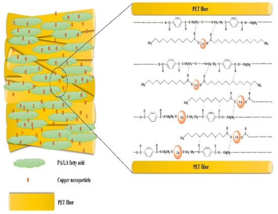 Schematic of incorporation of copper nanoparticles into PCM applied on the polyester fiber. Adapted from [35].