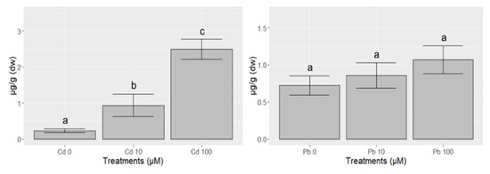 Concentrations (µg·g−1 ± SE) of Cd and Pb in leaves of H. perforatum after 3 weeks of the exposure to solutions containing either water (Cd 0 and Pb 0), Cd or Pb (10 and 100 µM). Different letters indicate statistically significant (p < 0.05) differences between treatments.