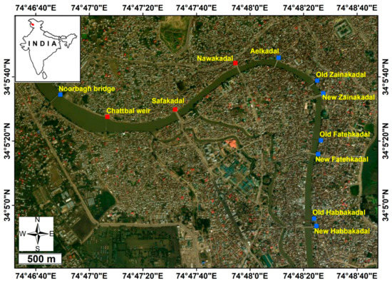 Location of the affected stretch of the Jhelum River, indicated by red dots. Blue dots indicate prominent locations along the unaffected portion of Jhelum River, Srinagar City. Background image: IKONOS GeoEye, dated 21 September 2018.