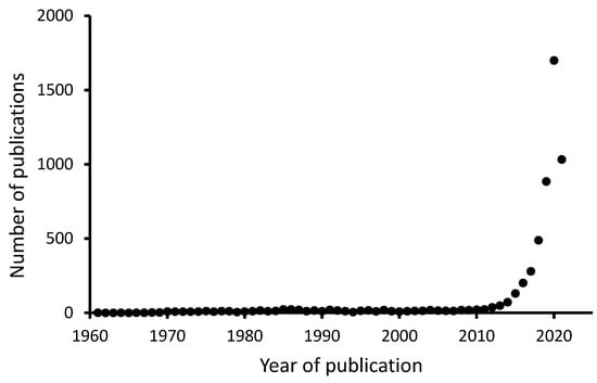 A literature search in the Scopus database for “microplastics” in the “title, abstract or keywords” published from 1961 to 3 May 2021, resulted in a total of 5453 articles (S1). There were no differences in the annual publication output observed before 2011, and the numbers of published papers per year were less than 5 and 25 before 1970 and 2012, respectively (Figure 1). To screen the pertinent articles for this review, articles dealing with sources of microplastic, mechanisms of microplastic formation, fate and behavior of microplastics in environmental systems, health impacts of microplastics and their remediation options were selected based on their title, abstract and keywords. Moreover, to address up-to-date scientific research outputs with respect to microplastics, more emphasis was given to the latest publications in the period 2011–2021. The authors believe that this review is important in order to design and search for alternative best technologies for remediation of microplastics in the future.