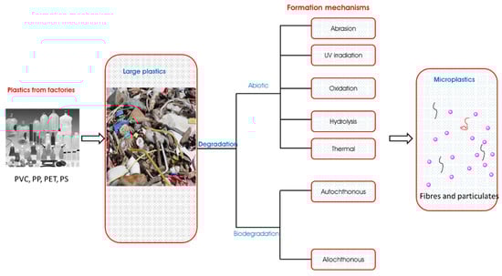 To facilitate the management of microplastics and reduce their environmental impacts, the sources, fate, and environmental behavior of microplastics have to be understood []. The following sections provide a brief review of mechanisms of microplastic formation, their behavior, and fate in different environmental compartments.