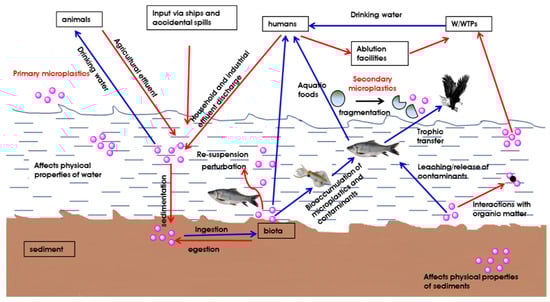 The position of microplastics in aquatic systems is influenced by various dynamics including fouling and their density, and determines their impacts on marine organisms. After fragmentation, lower density microplastics float on the water surface, while higher density ones sink to accumulate in the sediment [,]. Thereafter, there is an interchanging of the microplastics between biota, water, and sediment through bioturbation, ingestion, and excretion (Figure 3). In fact, the freshwater input with the accompanying turbulence can result in the mixing or disturbance of microplastics in the sea or ocean, causing a redistribution of the microplastics. A recent modelling study on the transportation of microplastics confirmed that river hydrodynamics greatly influence microplastics distribution in rivers and their introduction into marine systems [].