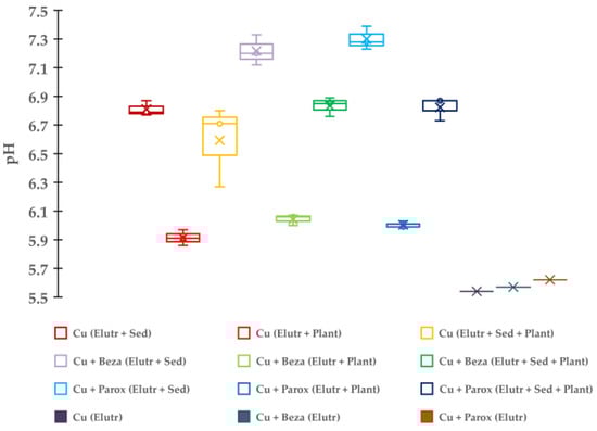 The pH of elutriates without sediment or plants was ca. 5.5 (Figure 1), probably due to the Cu standard solution used to dope the solutions. When sediment was present, either with or without plants, the mean pH values in elutriates increased to 7.30, particularly in the presence of the pharmaceutical compounds. This indicates that sediments promoted a neutral pH. When only plants were present, a pH of ca. 6.00 was observed, indicating that plants contributed to a decrease in elutriate pH relatively to the presence of sediments. Plants are known to release exudate compounds in the presence of metals, including low molecular organic acids, which can contribute to pH decrease (e.g., []). This was only observed in the absence of sediment, probably because sediment has a buffering capacity.
